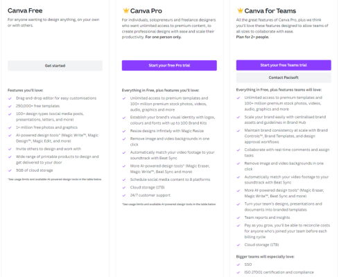 - Canva Pro: Gói Canva chuyên nghiệp dành cho các cá nhân, doanh nhân độc lập và nhà thiết kế tự do muốn truy cập không giới hạn vào nội dung cao cấp, để tạo ra các thiết kế chuyên nghiệp một cách dễ dàng và mở rộng quy mô năng suất.