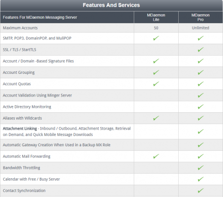 - MDaemon Email Server, bao gồm addon bổ sung ( MDaemon Antivirus, MDaemon Connector for Outlook, MDaemon ActiveSync và Email Archiving Server (Mailstore)