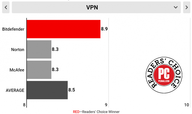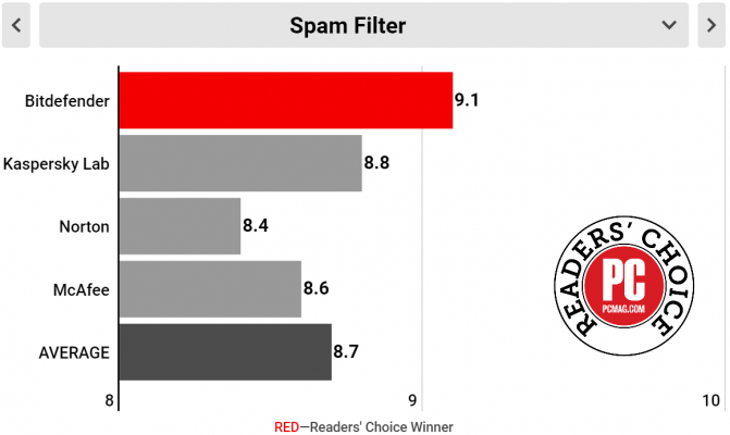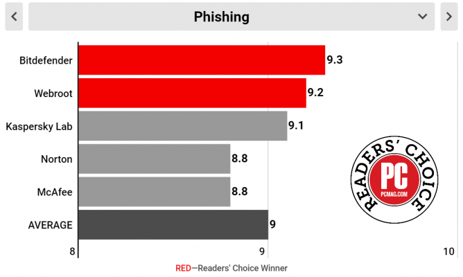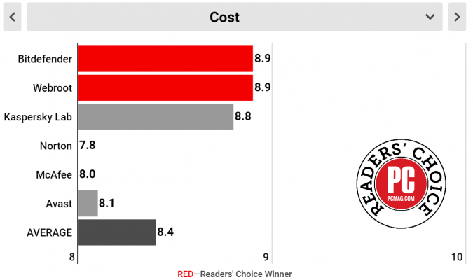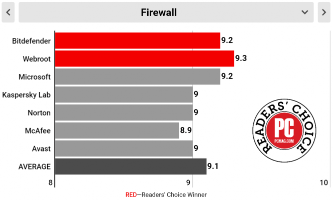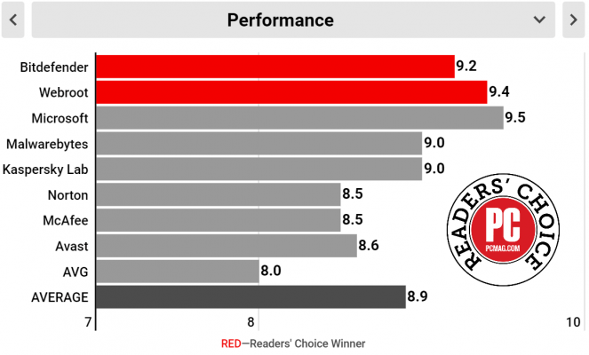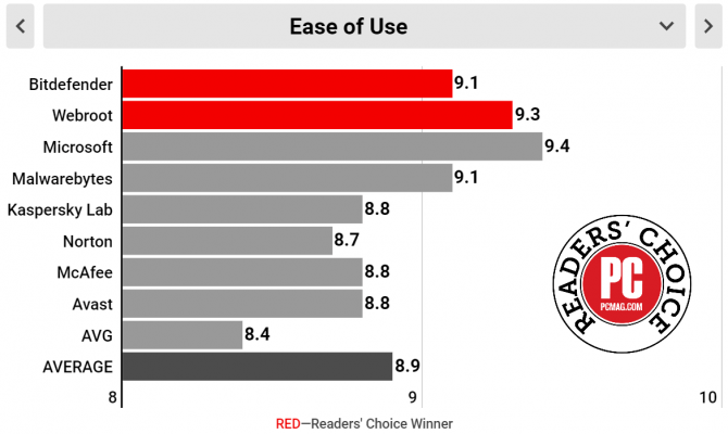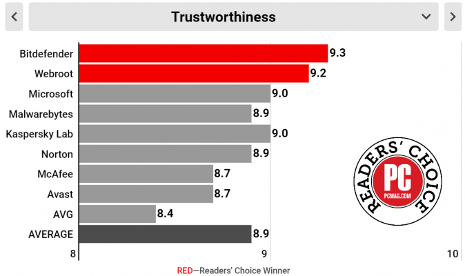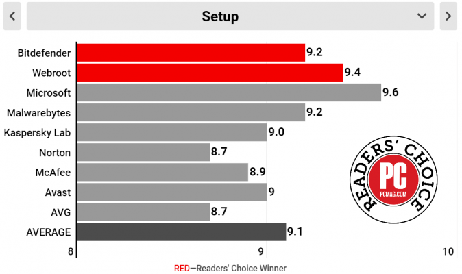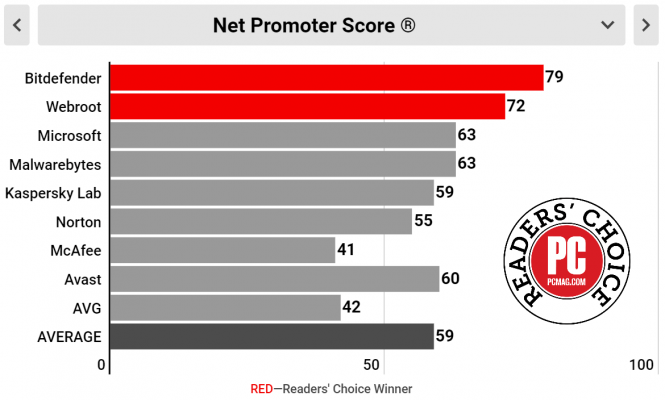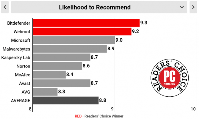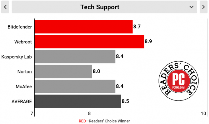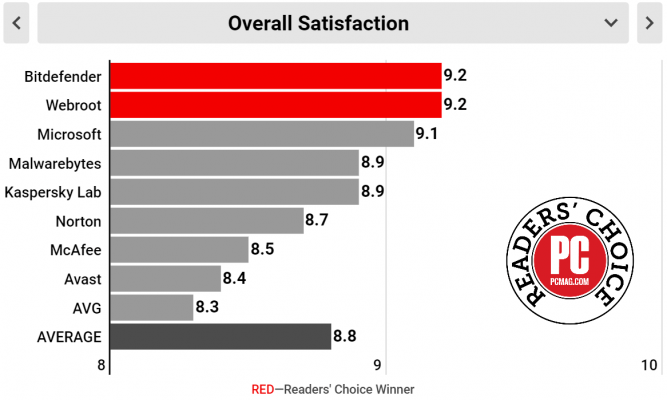Bitdefender đã cải thiện số điểm vốn đã rất xuất sắc của mình từ 9,1 lên 9,2 trên thang điểm từ 0 (cực kỳ không hài lòng) lên 10 (cực kỳ hài lòng). Đó là đủ để hòa với Webroot, người chiến thắng năm ngoái, chứng kiến điểm số hài lòng tổng thể của nó giảm từ mức cao của năm ngoái là 9,4 xuống 9,2. ESET, đã vô địch hai năm trước và đứng thứ hai vào năm ngoái với 9,3, đã không nhận được đủ phản hồi trong cuộc khảo sát này.