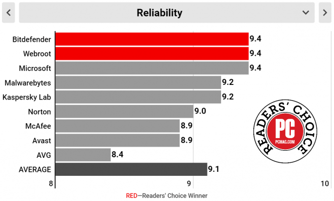 Người về nhì, Microsoft, cũng nhận được rất nhiều lời khen ngợi từ độc giả, nâng điểm tổng thể của hãng từ 8,8 lần trước lên 9,1 cho năm 2021. Đó là nhờ Microsoft Windows Defender, một phần không thể thiếu của Windows 10. để bảo vệ PC của bạn nếu không có chương trình chống virus nào khác được cài đặt. (Nhiều độc giả đã đánh giá đây là một bộ bảo mật vì Microsoft cũng bao gồm tường lửa, cũng như bảo vệ chống ransomware và lừa đảo.) tất cả là do sự tích hợp Windows đó. Nó cũng đánh giá rất tốt về độ tin cậy, kiếm được 9,4 để buộc cả Bitdefender và Webroot.