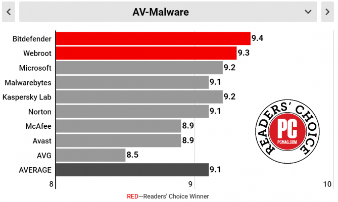 Đây là lần ra mắt thứ hai của công ty với tư cách là người chiến thắng giải AV, nâng điểm tổng thể từ 9,0 lần trước lên 9,1. Tất cả các xếp hạng của Malwarebytes đều khá ấn tượng, nhận được 9,1 hoặc cao hơn về mọi thứ ngoại trừ hỗ trợ công nghệ (vẫn đứng đầu với 8,5) và độ tin cậy (trong đó nó liên kết với Webroot cho điểm tốt nhất với 8,8). Webroot cũng liên kết với Malwarebytes để dễ sử dụng (9.2).