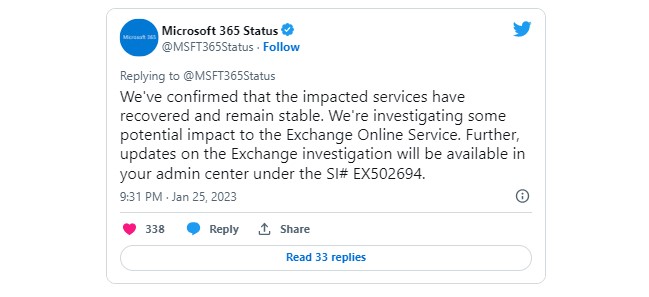 Microsoft đã mất hơn 5 tiếng để khôi phục Microsoft 365: “Từ 07:05 UTC đến 12:43 UTC ngày 25 tháng 1 năm 2023, khách hàng đã gặp sự cố kết nối mạng, mạng chậm hoặc hết thời gian chờ khi cố gắng kết nối với các tài nguyên trong Azure, cũng như các dịch vụ khác của Microsoft bao gồm Microsoft 365 và Power Platform”.